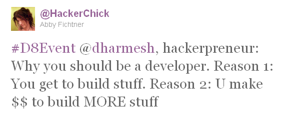 There are few certainties in life: death, taxes and Dharmesh Shah giving killer presentations. This time Dharmesh talked about the rewards of having a career in startups as a developer like not having to go into management. In typical Dharmesh fashion, he was insightful, entertaining and clever. Dharmesh's talk was best summed up by Microsoft Evangelist Abby Fichtner's tweet: