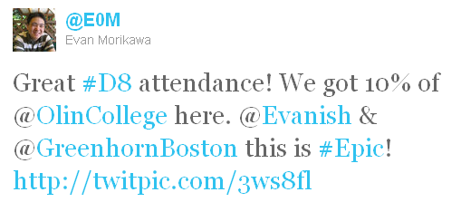 If you go to the mobile version of the d8event site you can see information on school breakdowns, which will show that the schools those guys attend were some of the most well represented at the event. The Olin students had awesome enthusiasm and Evan pointed out this amazing fact about him and his classmates:
